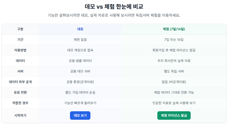 A. 데모는 이메일만 입력하면 곧바로 발급되는 공용 체험 계정으로, 샘플 데이터가 있는 환경에서 기능을 빠르게 둘러보실 수 있습니다. 체험(7일/14일)은 우리 회사만의 실제 자료를 별도 서버(독립서버)에 올려 사용하는 방식으로, 외부에 데이터가 공개되지 않으며 체험 기간 후 그대로 유료 서비스로 전환할 수 있습니다. 민감한 자료로 제대로 써보고 싶다면 체험, 먼저 화면만 간단히 보시려면 데모를 이용하시면 됩니다.