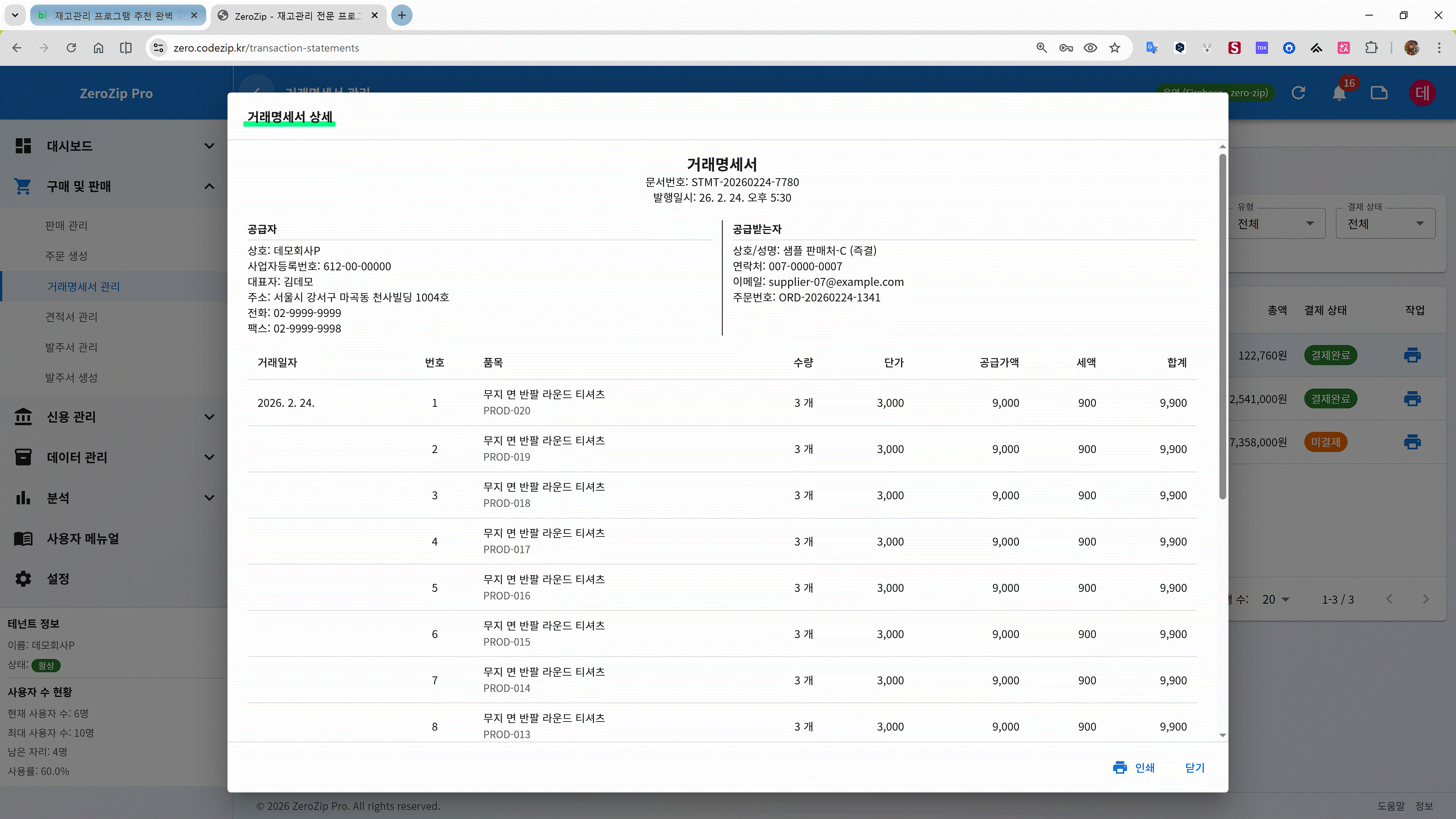 - 구매 및 판매 / "거래명세서 생성 및 상세"