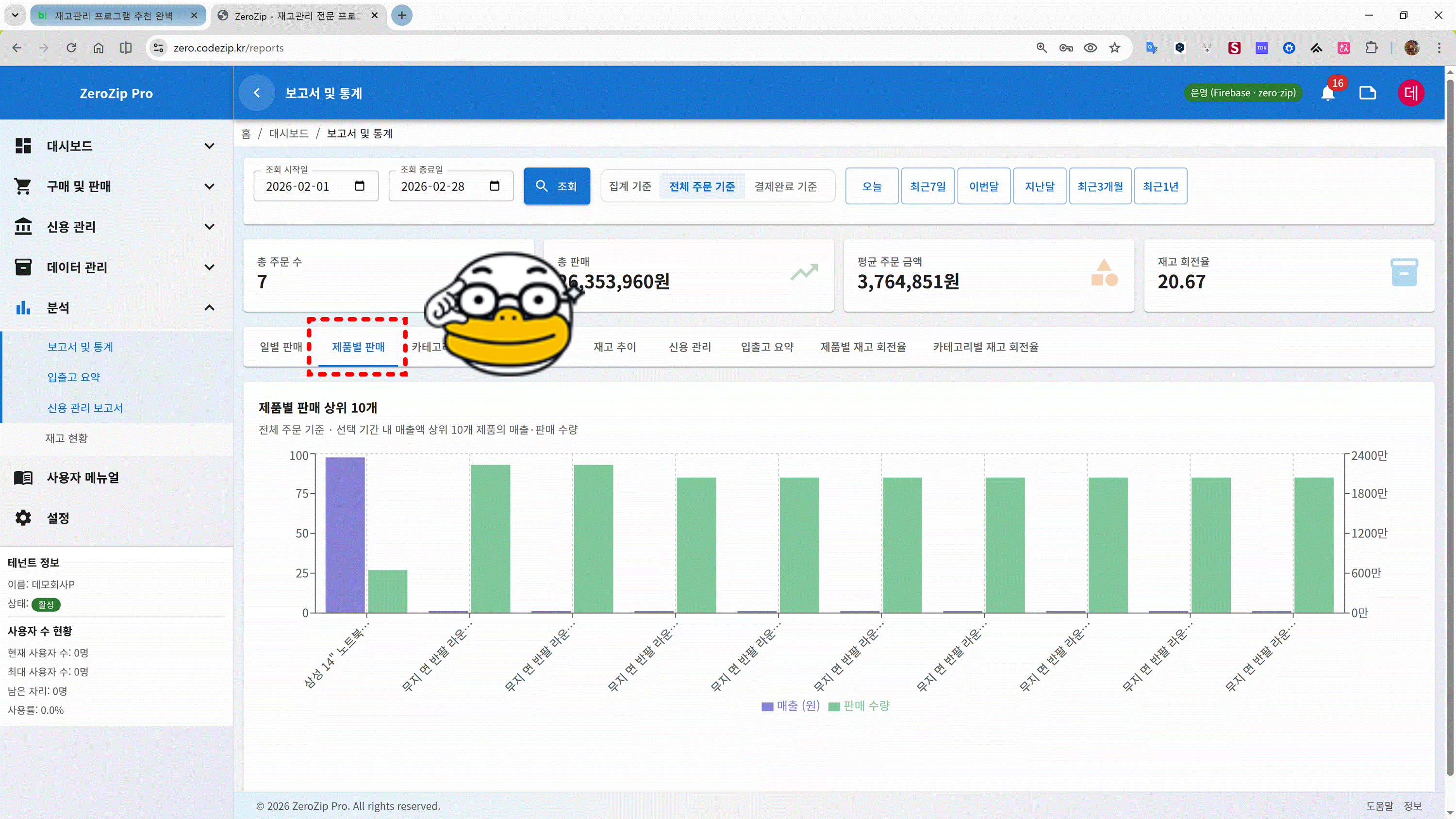 - 보고서 및 통계 / "제품별 판매" 그래프와 판매수량, 판매금액 까지 ~