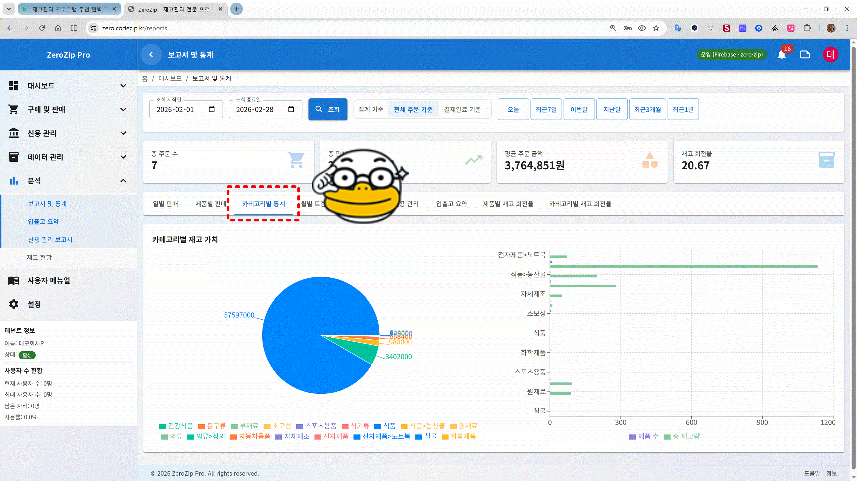 - 보고서 및 통계 / "카테고리별 통계" 로 카테고리 재고 가치를 판단~