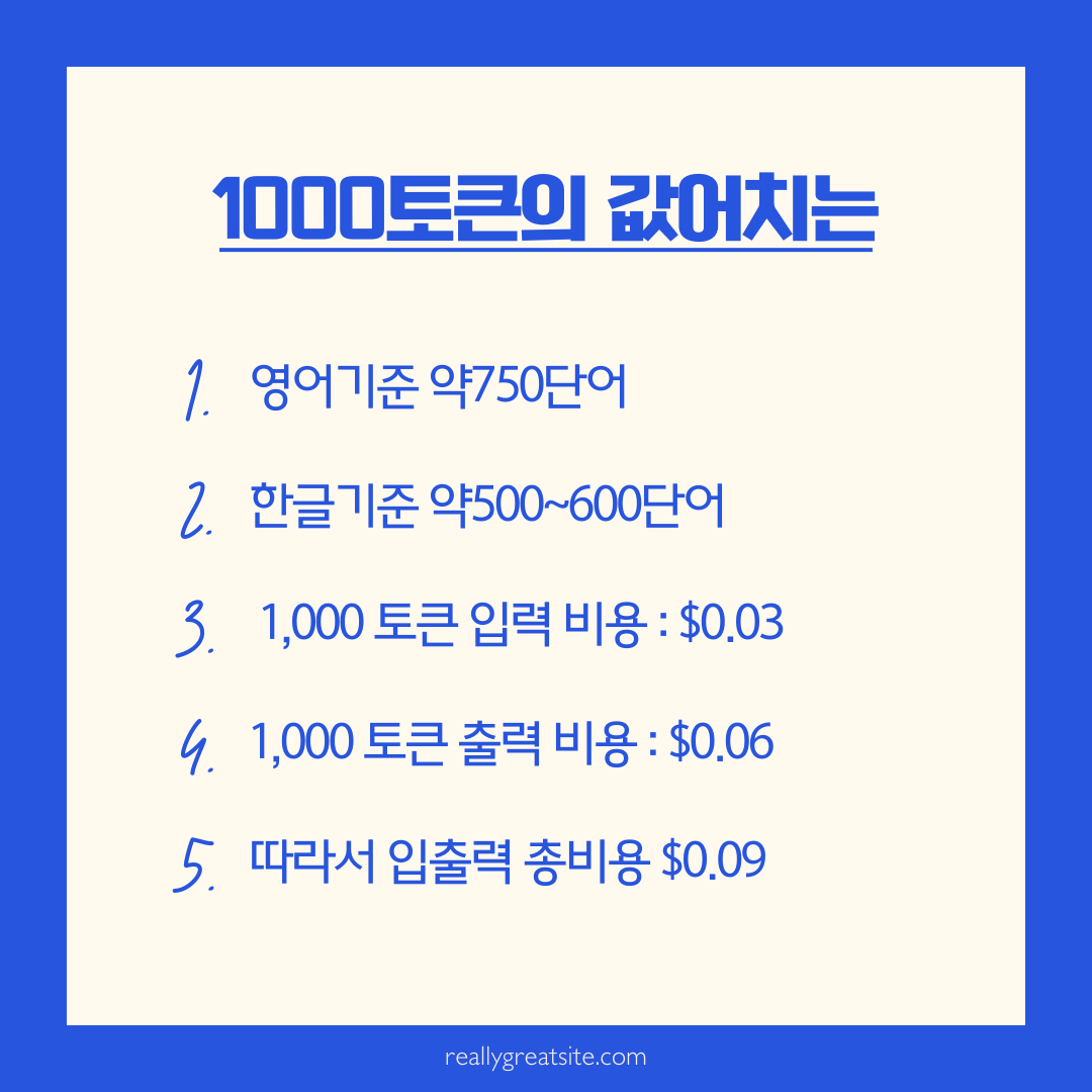 - 따라서 1,000 토큰을 입력하고 1,000 토큰을 출력하면 총 $0.09가 청구됩니다.