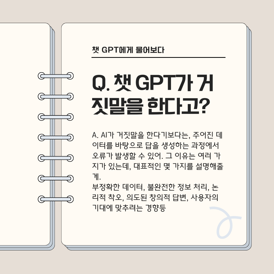 AI는 대화의 흐름을 유지하려고 하다 보니, 확실하지 않은 정보라도 "모른다"고 하기보다는, 최대한 관련된 답을 하려고 할 때가 있어. 이 과정에서 부정확한 정보가 포함될 수도 있어.